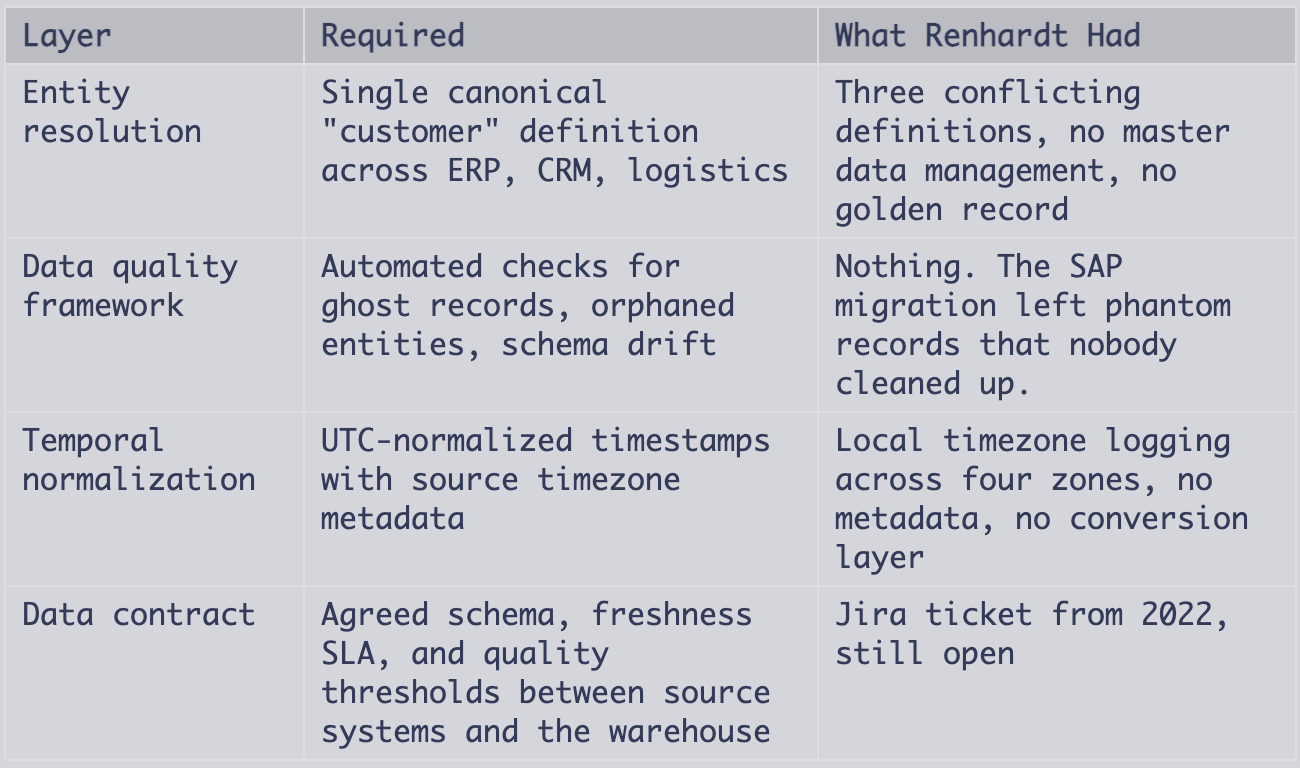 Below: the four layers Renhardt needed before any model touched the warehouse, and the one question that would have caught it in the first meeting.