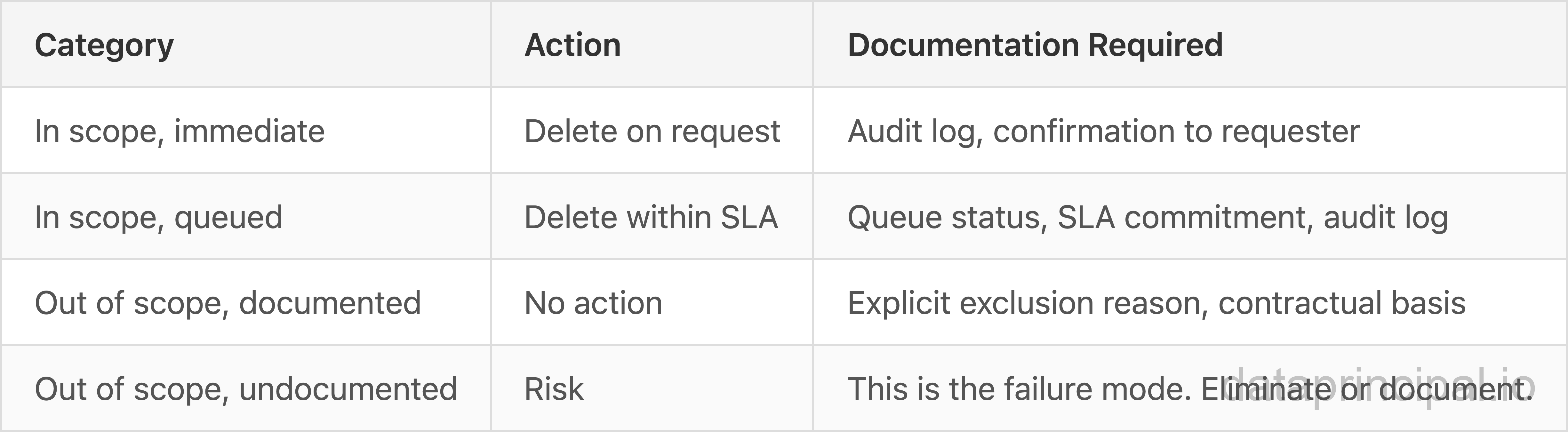 What systems were covered. What the deletion workflow was. What the SLAs were. What was explicitly out of scope and why.